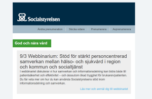 9/3 Webbinarium: Stöd för stärkt personcentrerad samverkan mellan hälso- och sjukvård i region och kommun och socialtjänst I webbinariet diskuterar vi hur samverkan och informationsdelning kan bidra både till patientsäkerhet och effektivitet … Läs mer